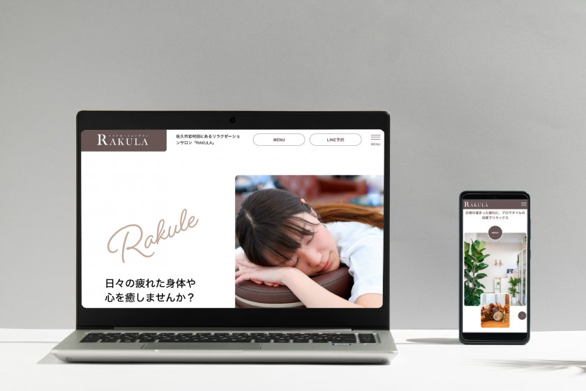 2023年、佐久市にてOPENしたリラクゼーションサロン RAKULA様。安定やリラックスを感じさせる茶色をベースに、落ち着きのあるホームページにしました。フォントはゴシック体を使用し、親しみやすい印象に。それぞれのメニューに写真を入れることで施術内容が分かりやすくなっています。(写真は弊社撮影)。他にも、ロゴデザイン、店舗看板も製作致しました。RAKULA様、ありがとうございました!