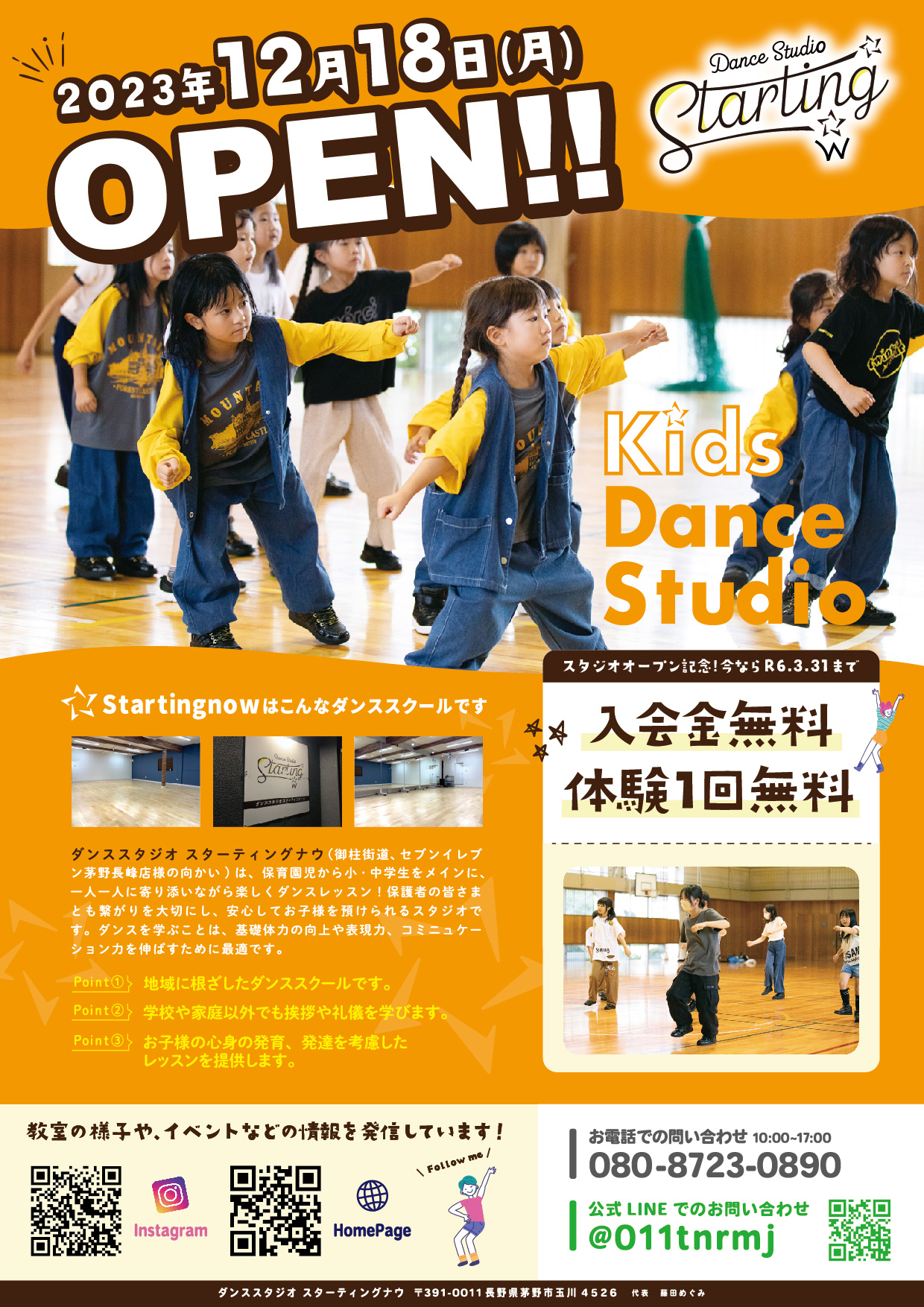 茅野市にOPENしたキッズダンススタジオ スターティングナウ様のオープンチラシを製作致しました。メインカラーにポップなイメージであるオレンジとイエローを使用し、ダンスを楽しむ子供たちの雰囲気が伝わるような写真をチョイス。写真撮影も致しました。この他に、ロゴや看板デザイン、LP製作を製作。スターティングナウ様。ありがとうございました!